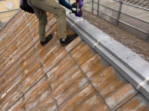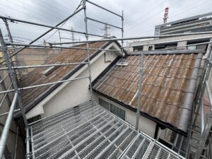 屋根には苔やカビも繁殖しており、経年による劣化が見受けられます。