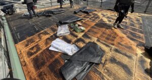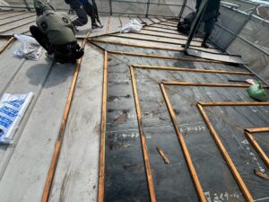 既存のルーフィングシートまで全て捲って、元の下地状態まで戻していきます。