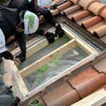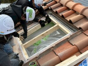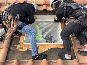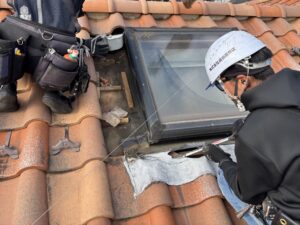 窓周辺の瓦を一時的に取り外して、土台から手を入れ、まずは窓の構造を取り外します。