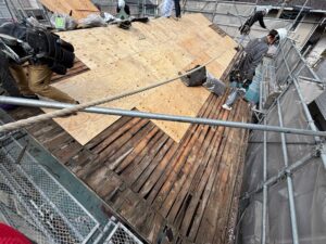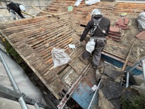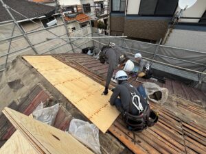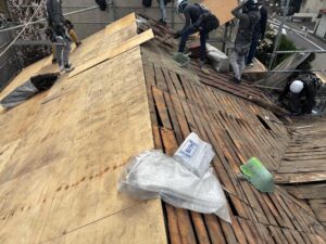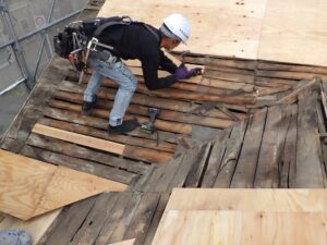このままでは屋根の強度が保たれず、危険なので、土台を新しく設置する「葺き替え工事」をおこなっていきます。
