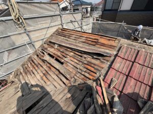 こちらのお住まいではセメント瓦をご使用になれていましたが、土台自体の劣化が激しかったので、野地板から新しく設置する「葺き替え工事」をおこないました。